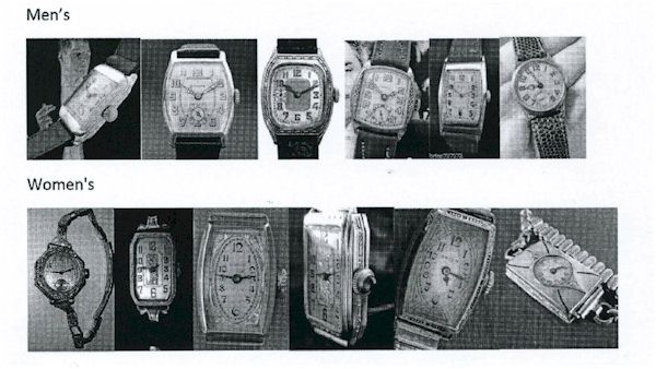 As stated earlier, wrist watches were becoming more and more popular due to their practicality. Below are some examples of both men’s and women’s watches from the Model A era. Most watches could be interchanged with different watch bands, given the owner’s preference and occasion. Men’s and women’s watch bands could be found made of woven mesh, available in nickel or in and “natural” gold filled. For men, also popular were leather straps, adjustable metal expansion bands, or flexible metal wristbands. Women’s watches also came with black silk ribbon bands with gold-filled or solid gold clasps (depending upon the quality of the watch), flexible expansion metal bracelets, gold-filled or 14-karat solid gold. Many high end women’s watches were sold with a gold or gold filled bracelet and included the black silk ribbon band as well.